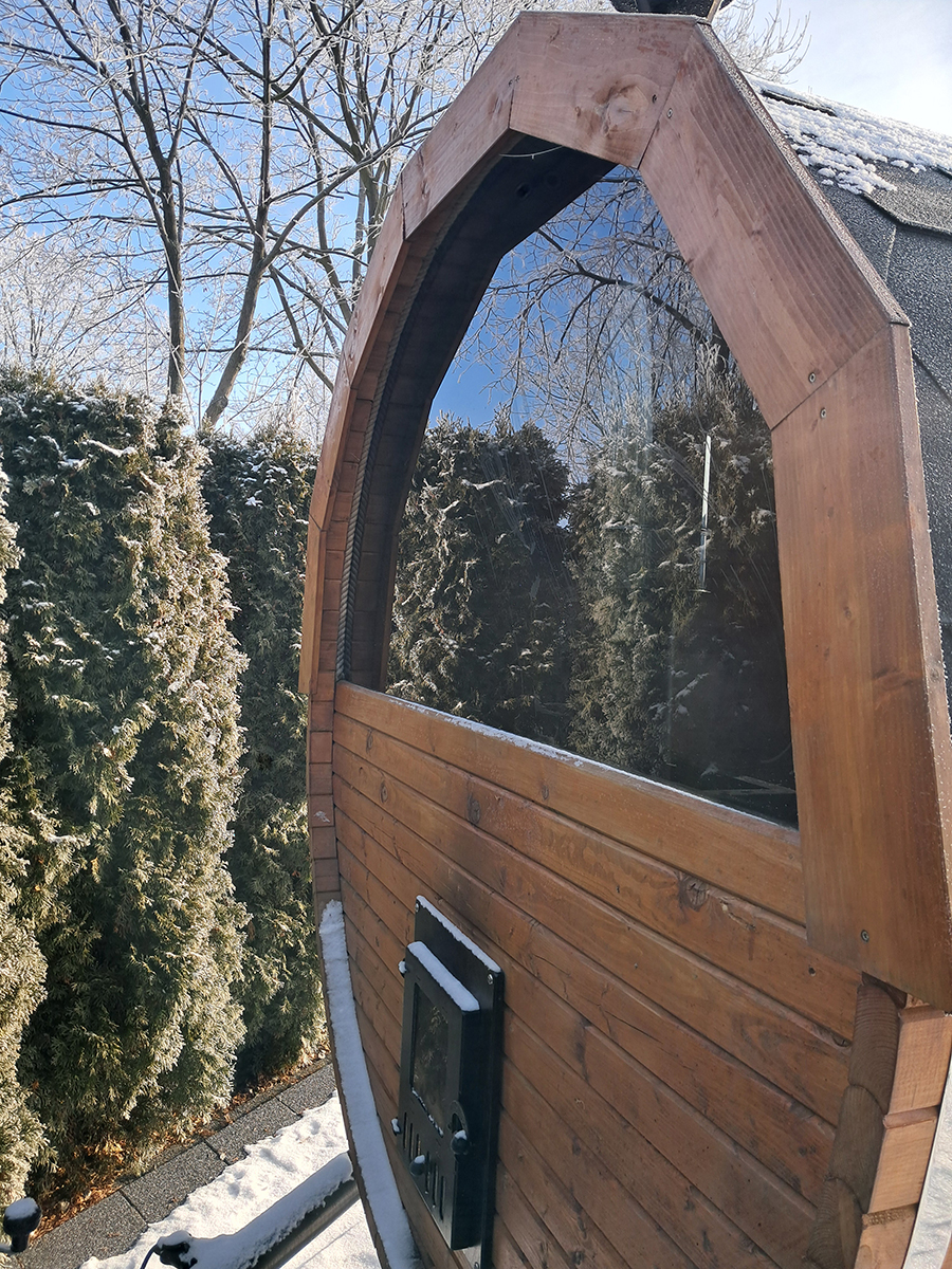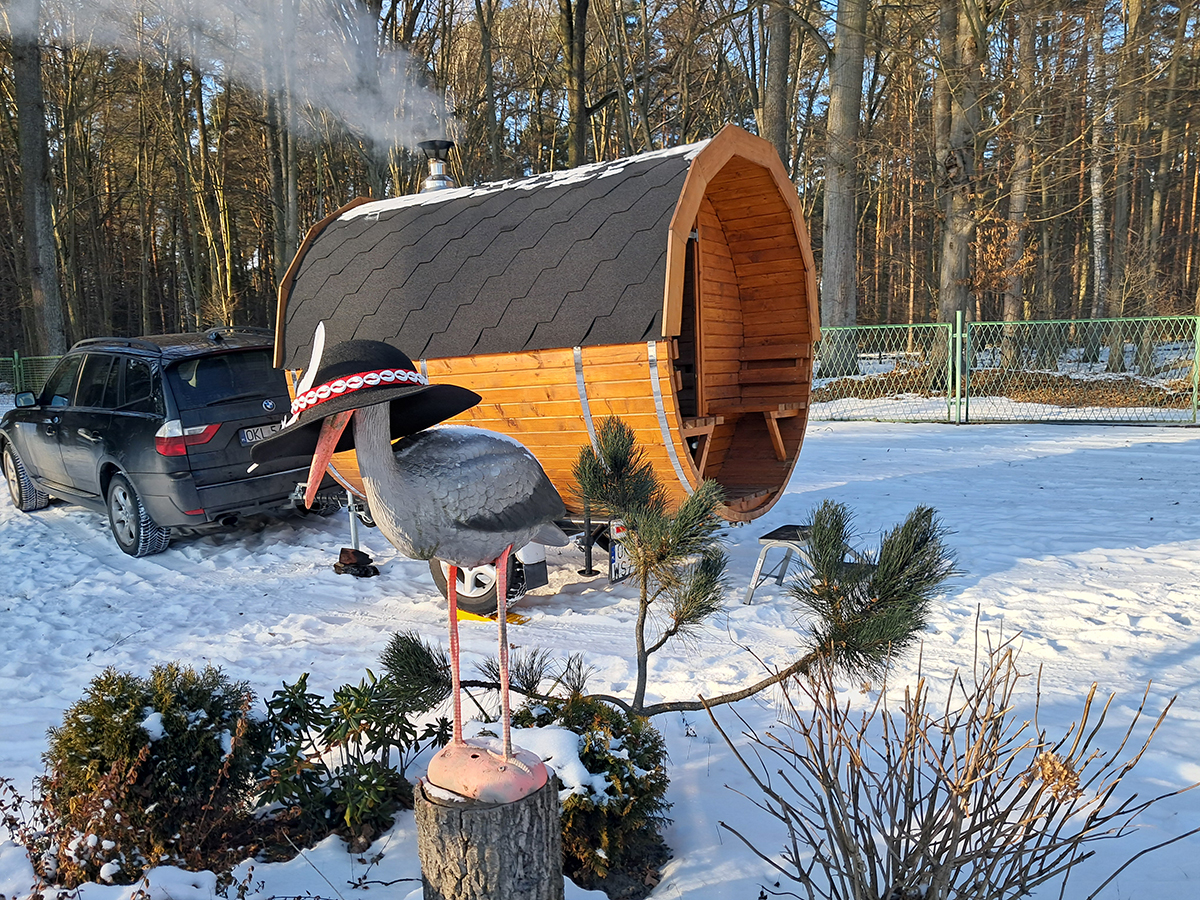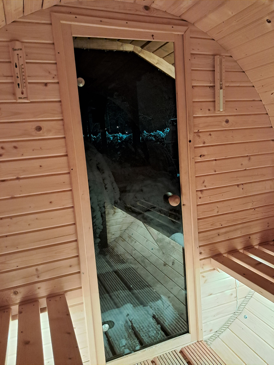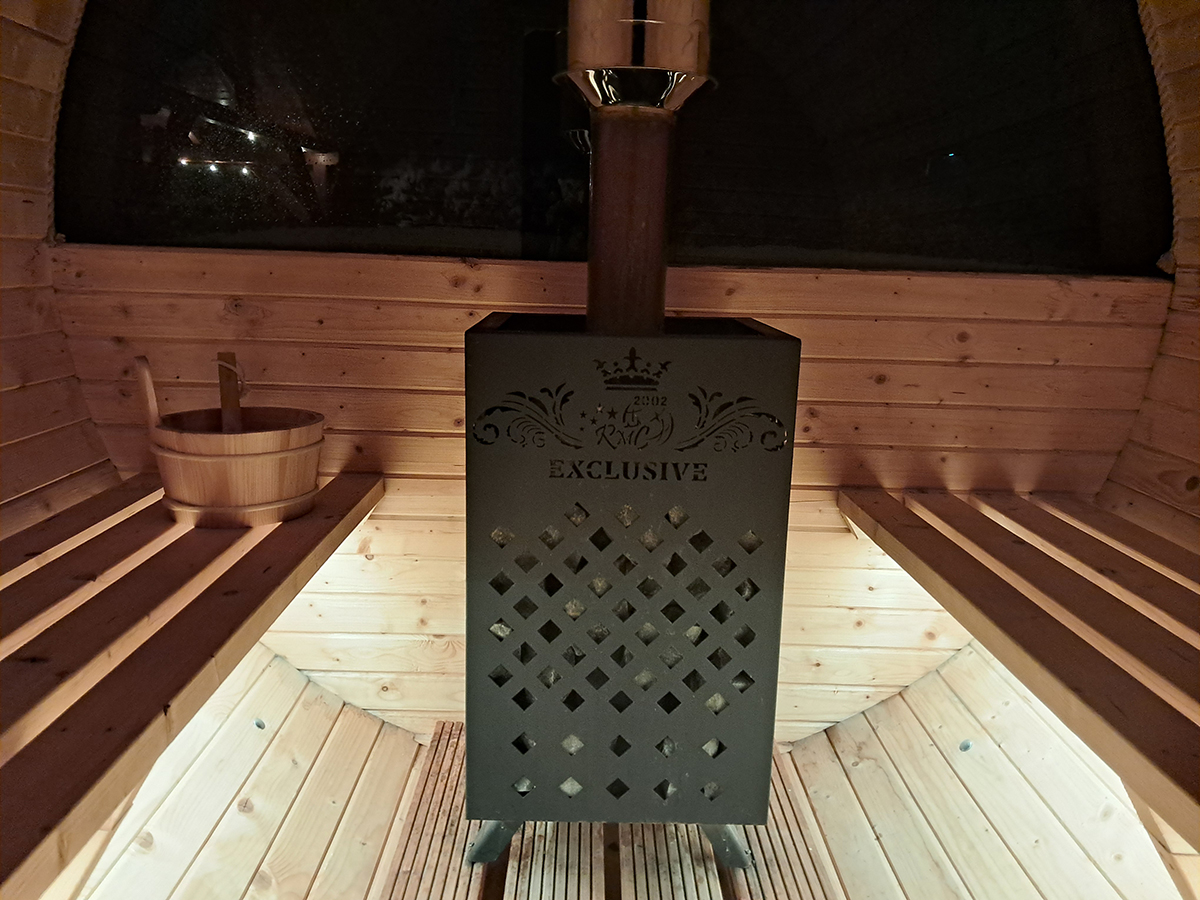 > beczka o długość 250 cm, z czego 200 cm to sauna, a 50 cm to przedsionek zewnętrzny